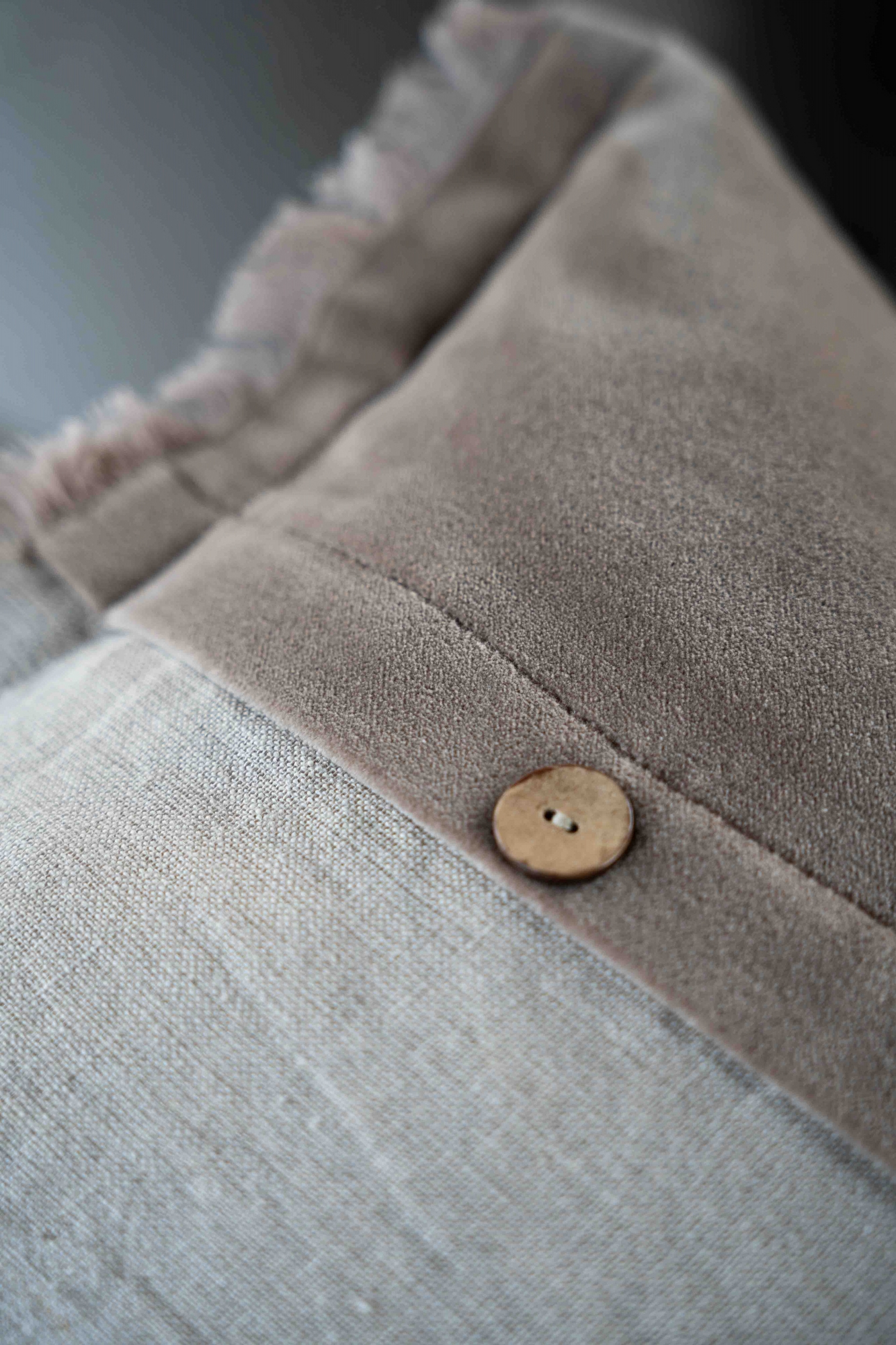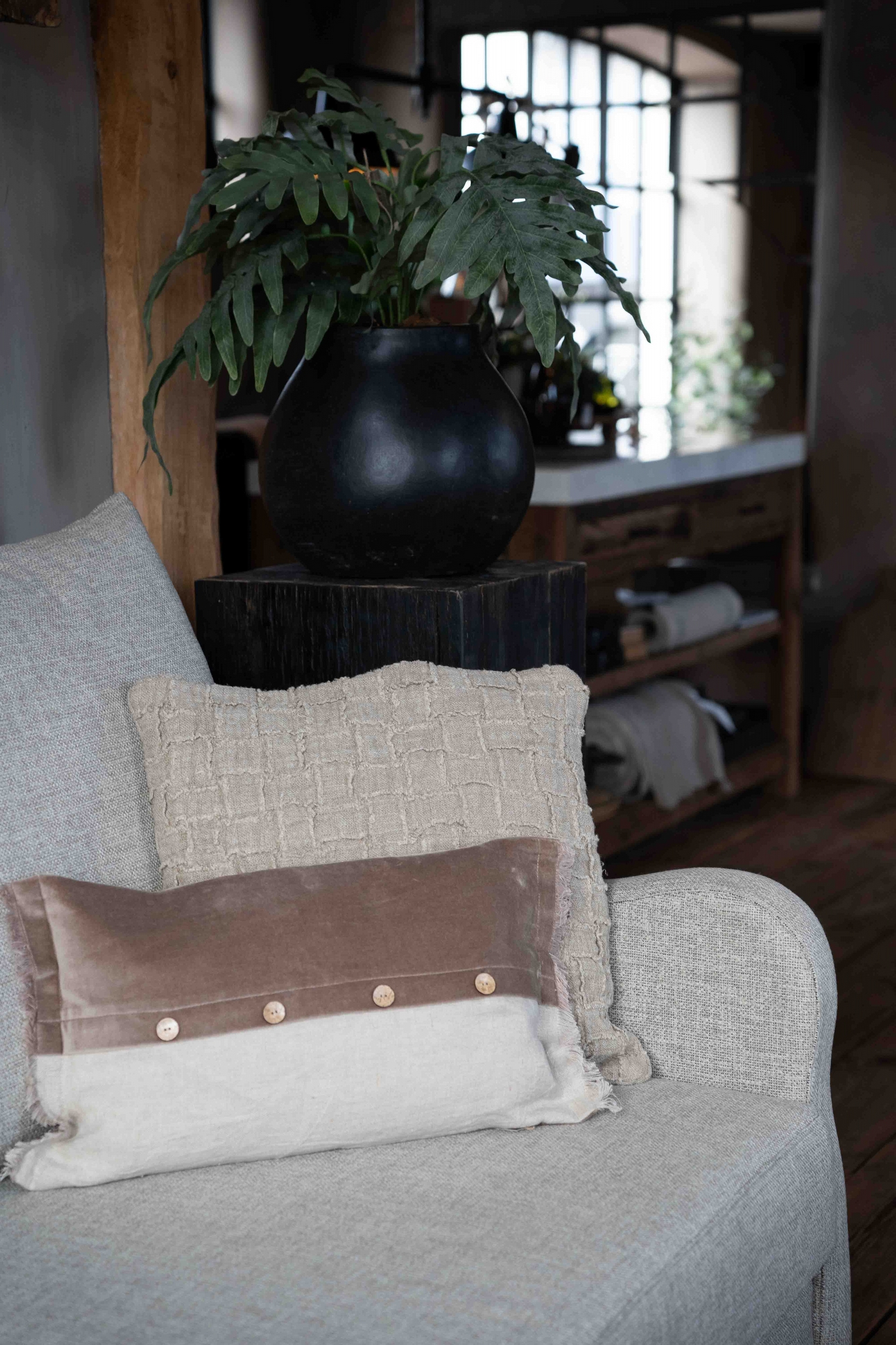 Kussen Linde is een rechthoekig sierkussen met een rustige en sobere uitstraling. Het kussen is gemaakt van een linnen stof met een zachte, natuurlijke structuur. De voorzijde is afgewerkt met een baan en vijf knopen, wat zorgt voor een subtiel detail zonder druk te worden.