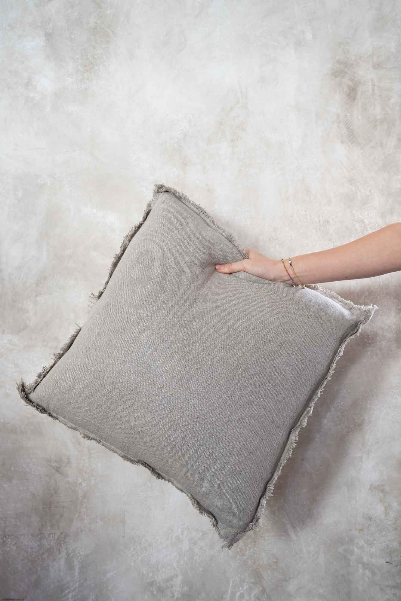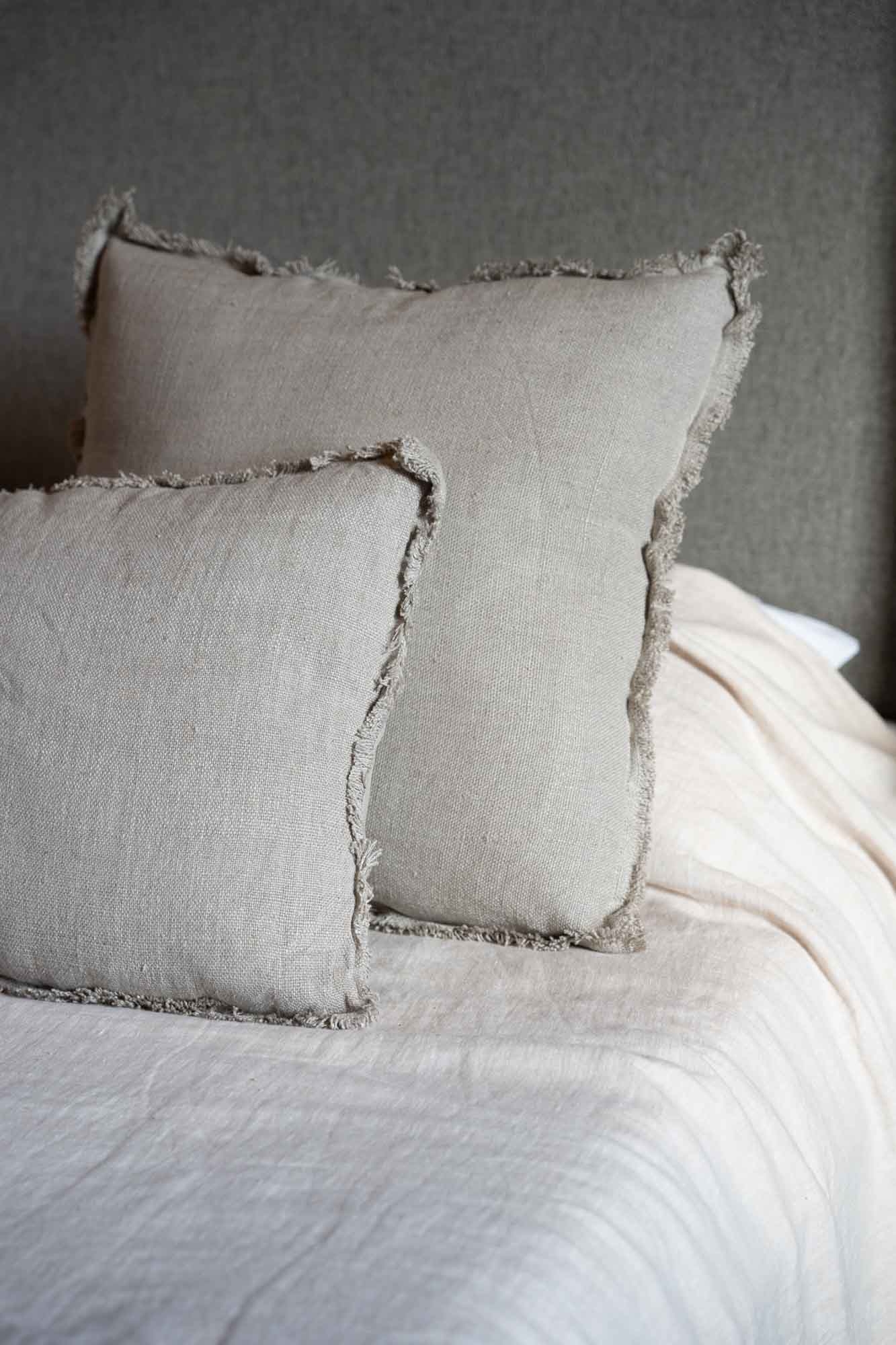 Een elegant en tijdloos linnen kussen dat rust en warmte brengt in elk interieur. Gemaakt van 100% puur linnen in een natuurlijke beige tint, met een subtiele structuur en afgewerkt met een speelse franjerand. De stof voelt zacht en luchtig aan en geeft je interieur die ontspannen, pure uitstraling die zo kenmerkend is voor linnen.