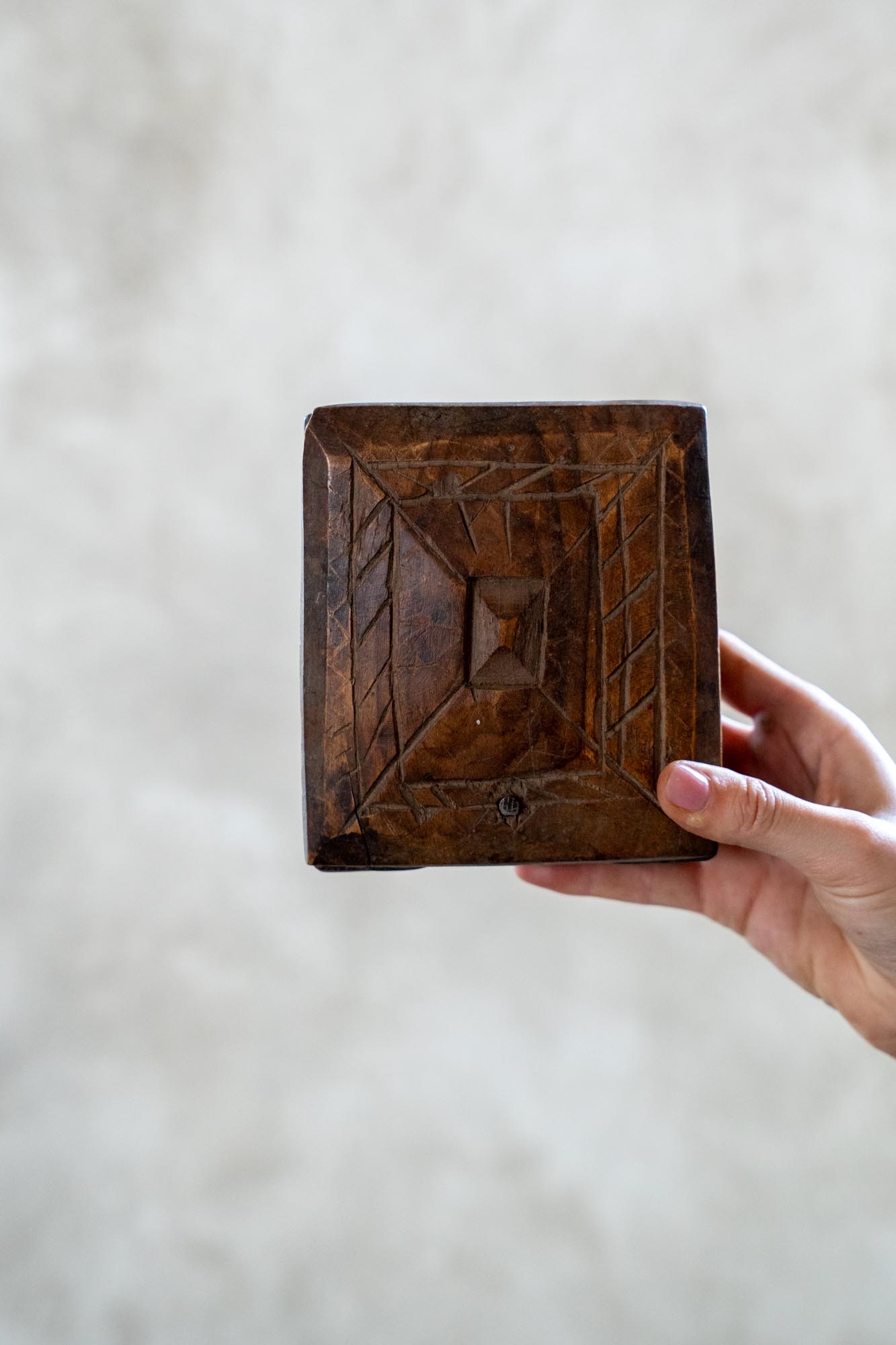Karaktervolle houten spicebox met een vierkante vorm en fijn uitgesneden geometrisch patroon in het deksel.