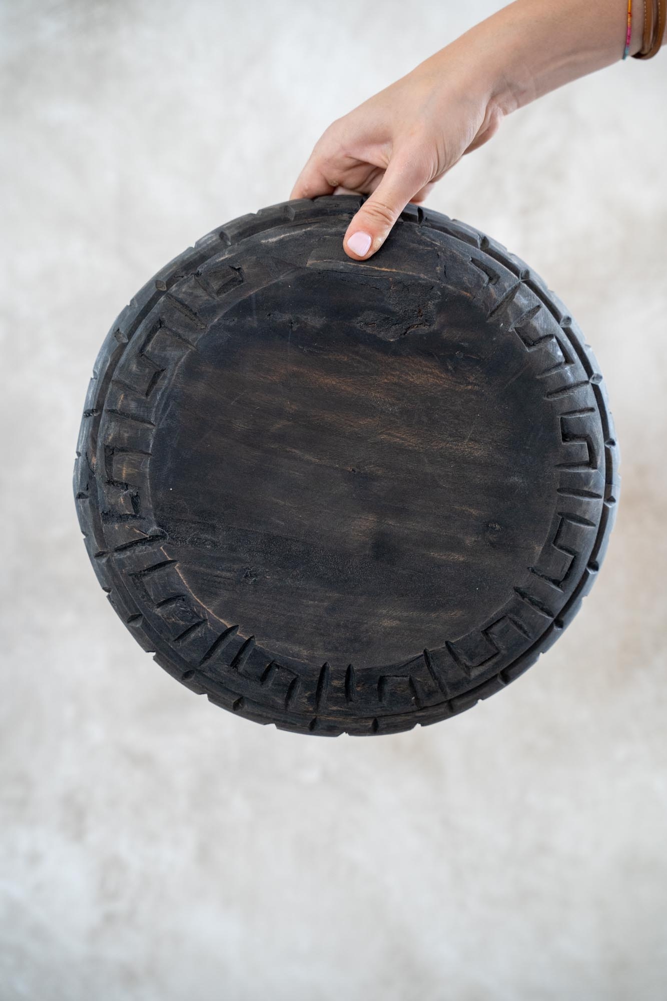 Stoer rond houten plateau met uitgesneden randmotief. Dit robuuste stuk kan zowel als schaal gebruikt worden om decoratie, fruit of kaarsen in te leggen, maar ook omgekeerd als verhoging om iets op te zetten. De diepe donkere houttint en het handgesneden patroon geven een authentieke en doorleefde uitstraling die perfect past in een landelijk en sober interieur.