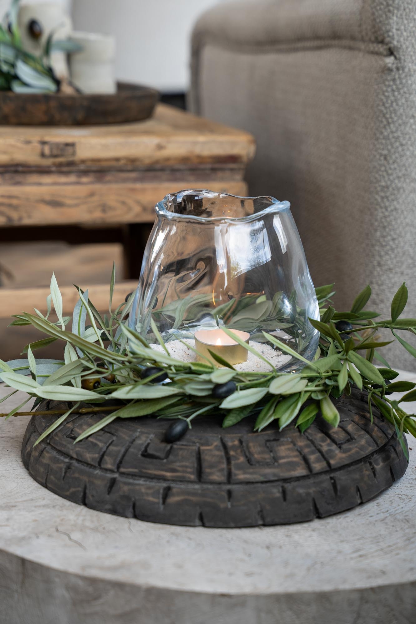 Stoer rond houten plateau met uitgesneden randmotief. Dit robuuste stuk kan zowel als schaal gebruikt worden om decoratie, fruit of kaarsen in te leggen.