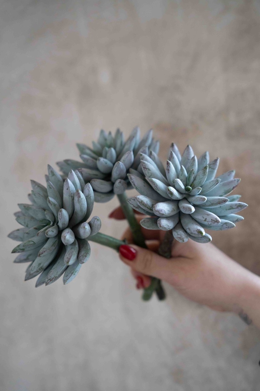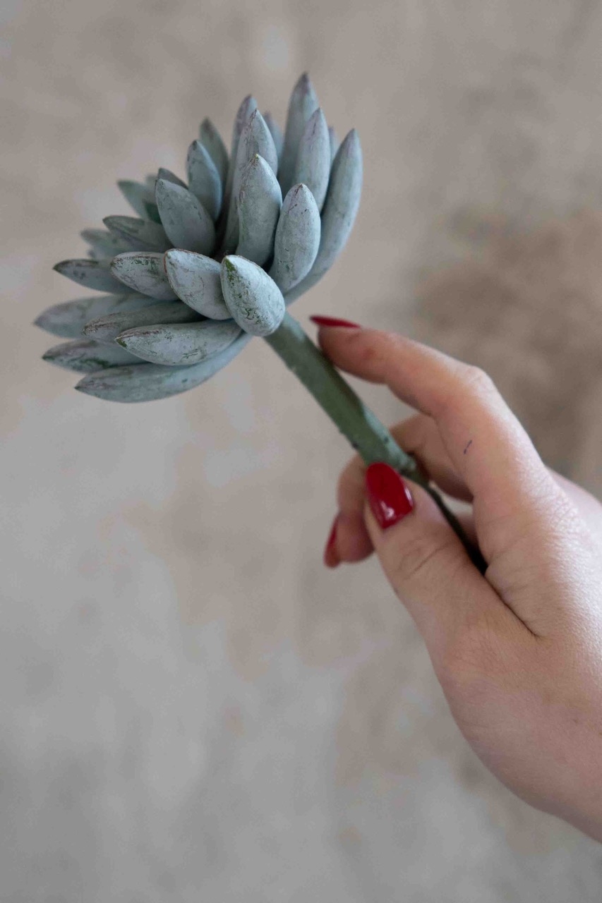 Deze kleine succulent kenmerkt zich door zijn compacte, puntige rozetvorm en zachte grijsgroene tinten. De verfijnde en natuurlijke uitstraling maken dit een subtiel en stijlvol element voor elk potje.