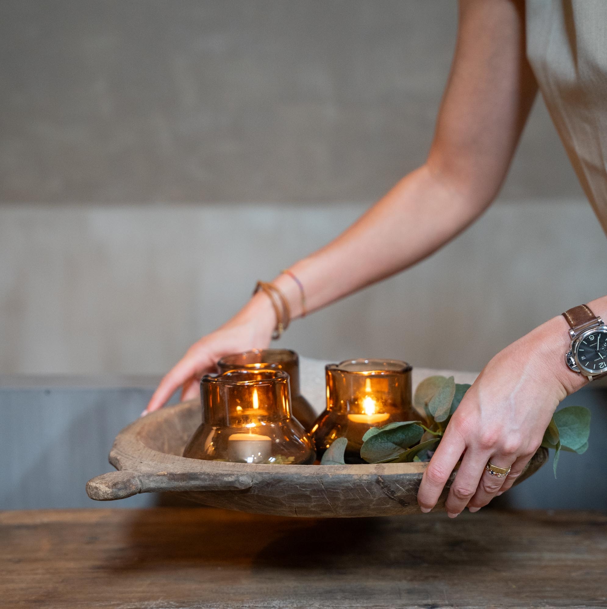Een donker Gommaire theelicht met een warme, gezellige uitstraling. Het dikke glas en de ronde vorm zorgen voor een natuurlijke look. Zodra het kaarsje brandt, ontstaat er een zacht, sfeervol licht. Mooi op een bijzettafel, in een open kast of op een plek waar wat extra warmte welkom is. Elk windlicht is uniek en mond geblazen.