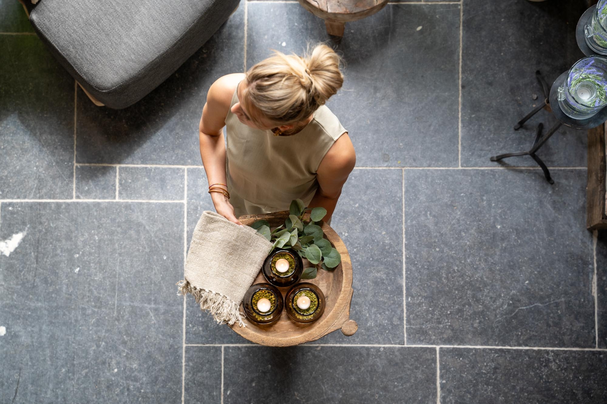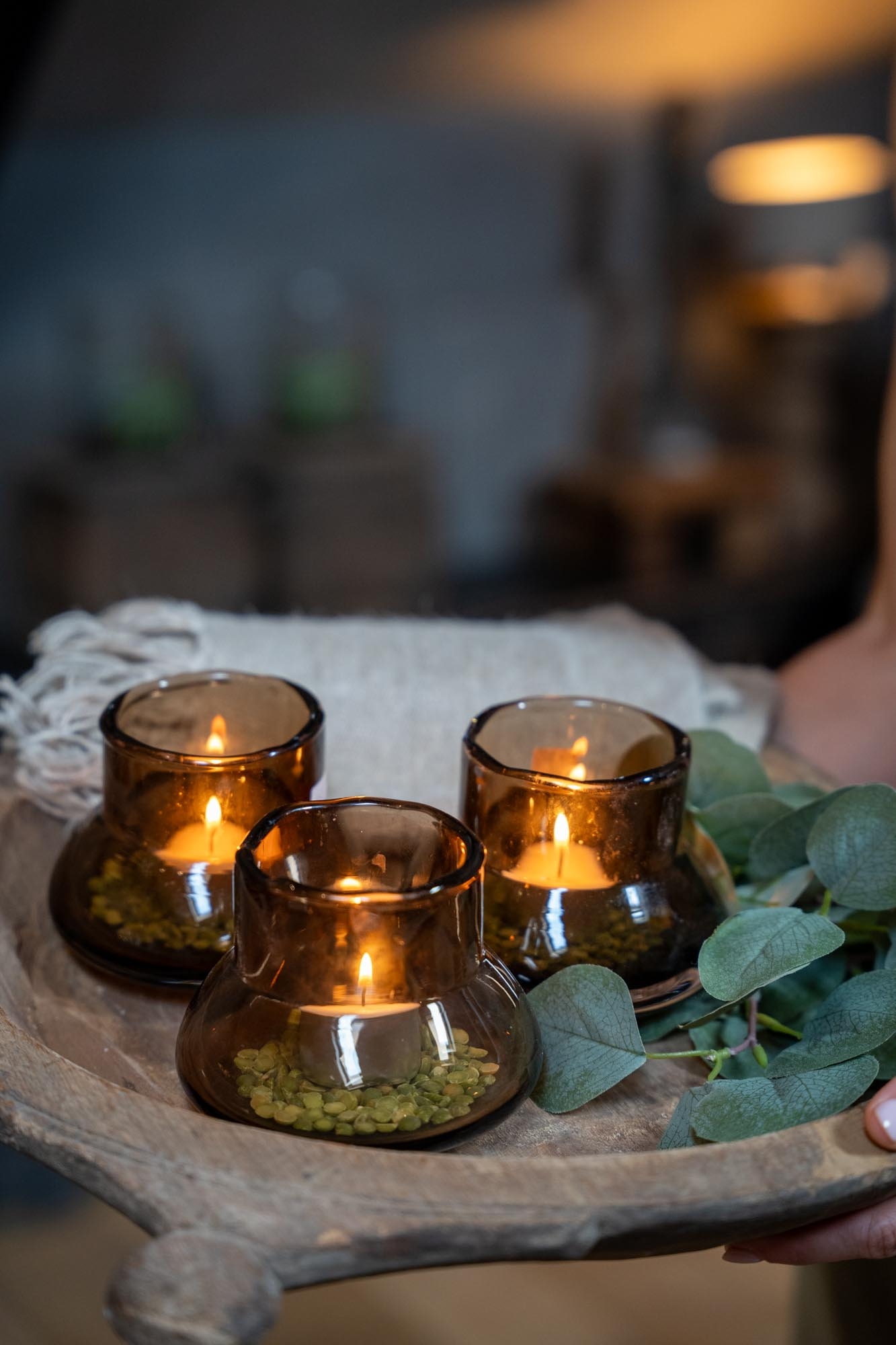 Een donker Gommaire theelicht met een warme, gezellige uitstraling. Het dikke glas en de ronde vorm zorgen voor een natuurlijke look.