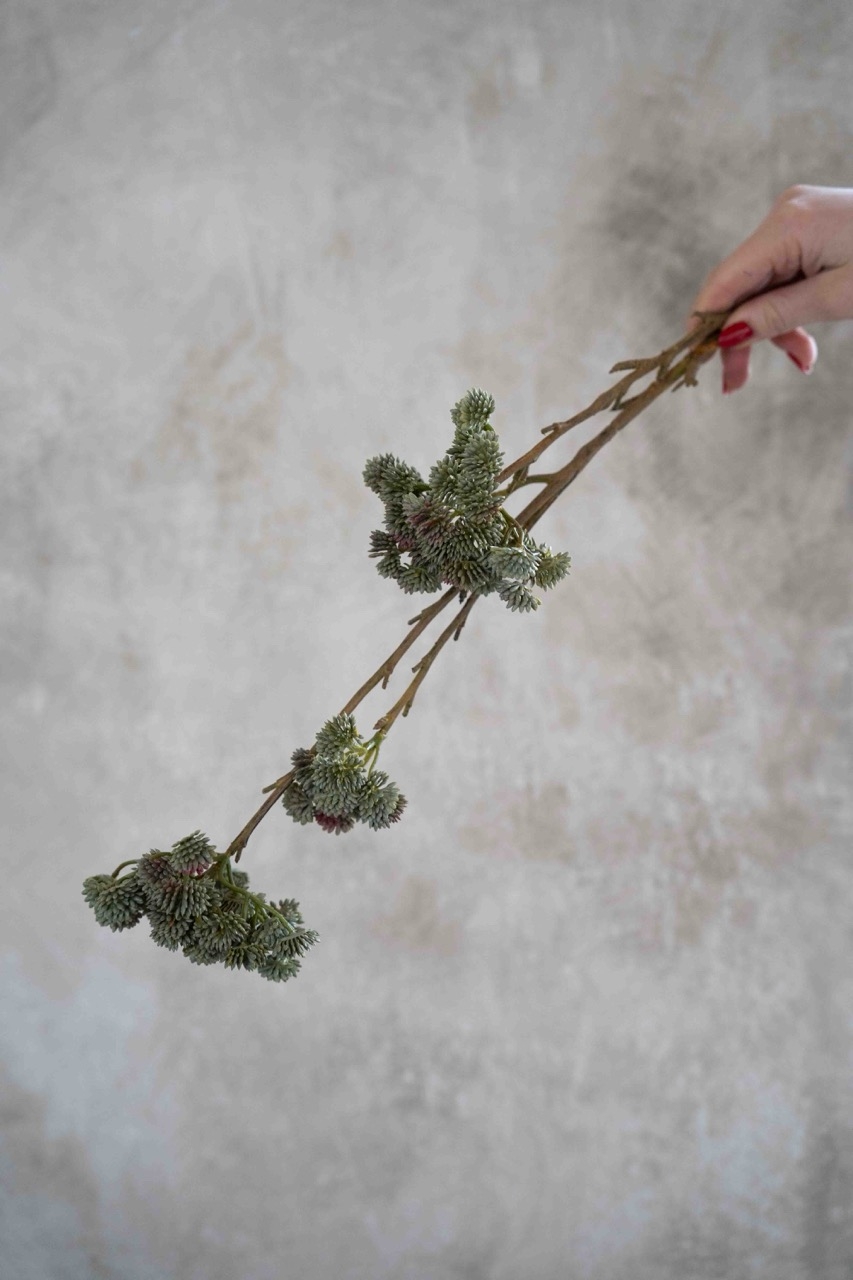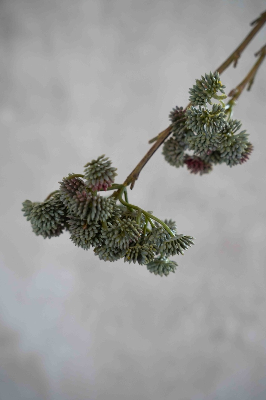 Deze tak bessencluster kenmerkt zich door zijn vertakte vorm met compacte clusters van fijne bessen in zachte, natuurlijke groentinten. De volle structuur en subtiele details geven een rustig en realistisch effect, waardoor de tak moeiteloos opgaat in elk arrangement.