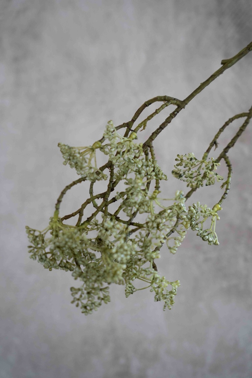 Deze tak bessentros kenmerkt zich door zijn fijne vertakkingen en subtiele trosjes met kleine bessen. De zachte groentinten en luchtige vorm geven een natuurlijk en rustig effect. Perfect om hoogte en detail toe te voegen aan een boeket of stijlvol solitair in een vaas te plaatsen.