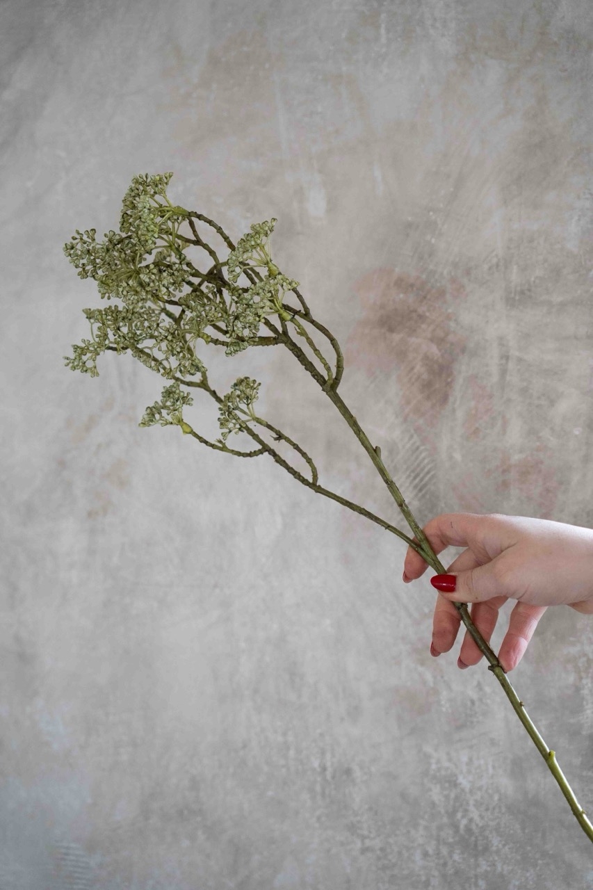 Deze tak bessentros kenmerkt zich door zijn fijne vertakkingen en subtiele trosjes met kleine bessen. De zachte groentinten en luchtige vorm geven een natuurlijk en rustig effect. Perfect om hoogte en detail toe te voegen aan een boeket of stijlvol solitair in een vaas te plaatsen. Alle takken zijn volledig onderhoudsvrij.