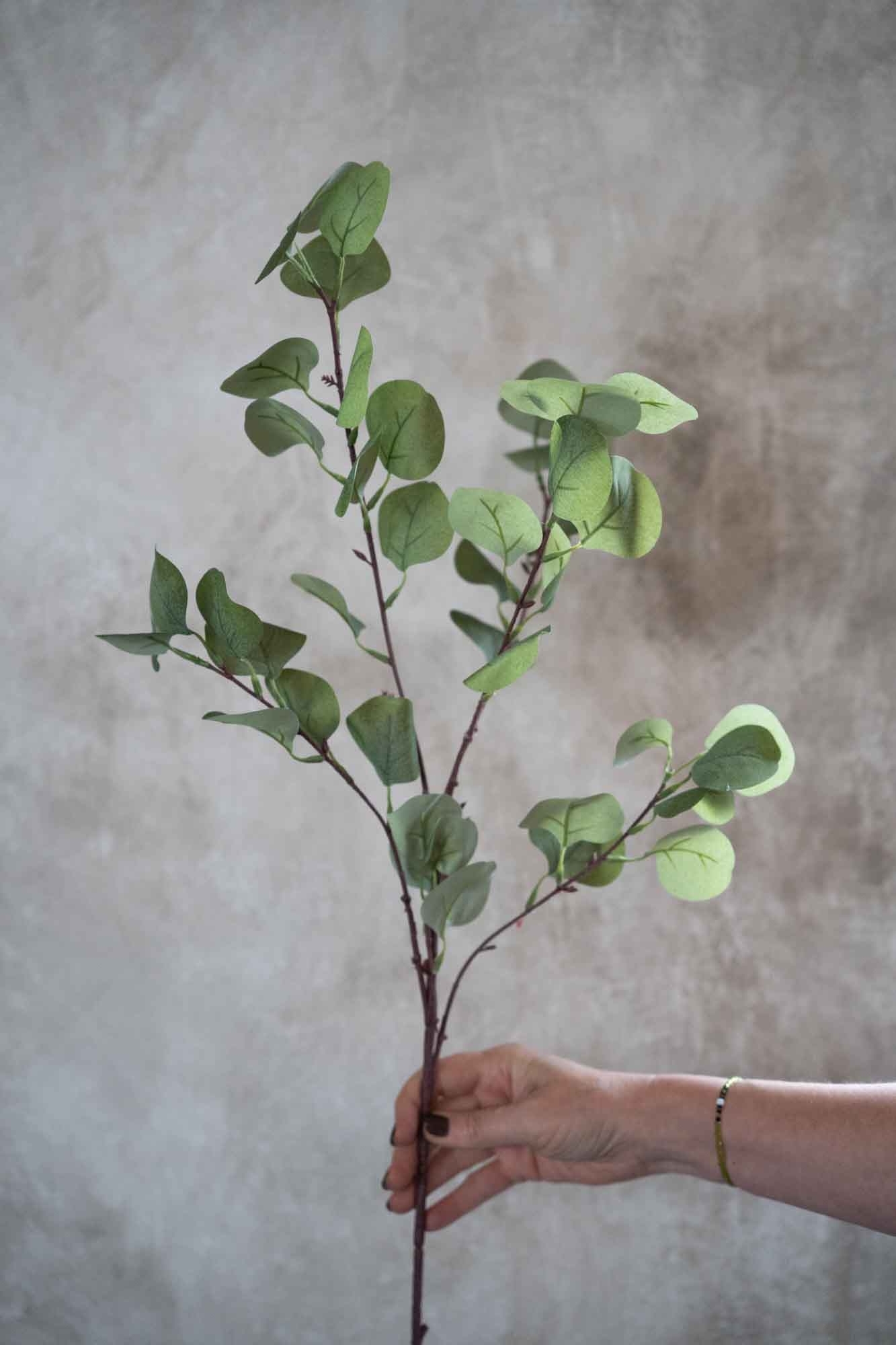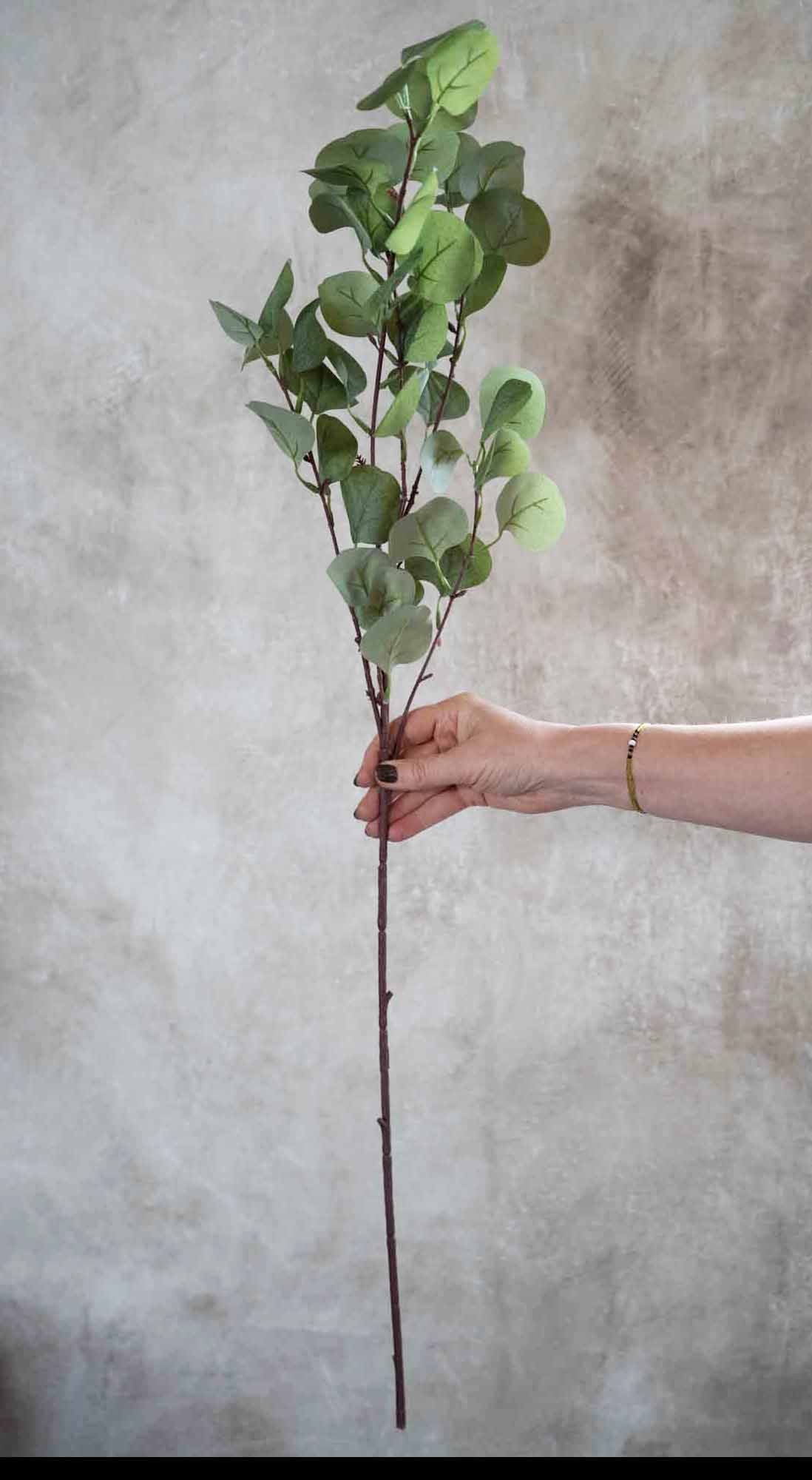Een elegante tak van kunst-eucalyptus met ronde, frisgroene bladeren en een natuurlijke uitstraling. Perfect om los in een vaas te plaatsen of te combineren met andere kunsttakken en bloemen.