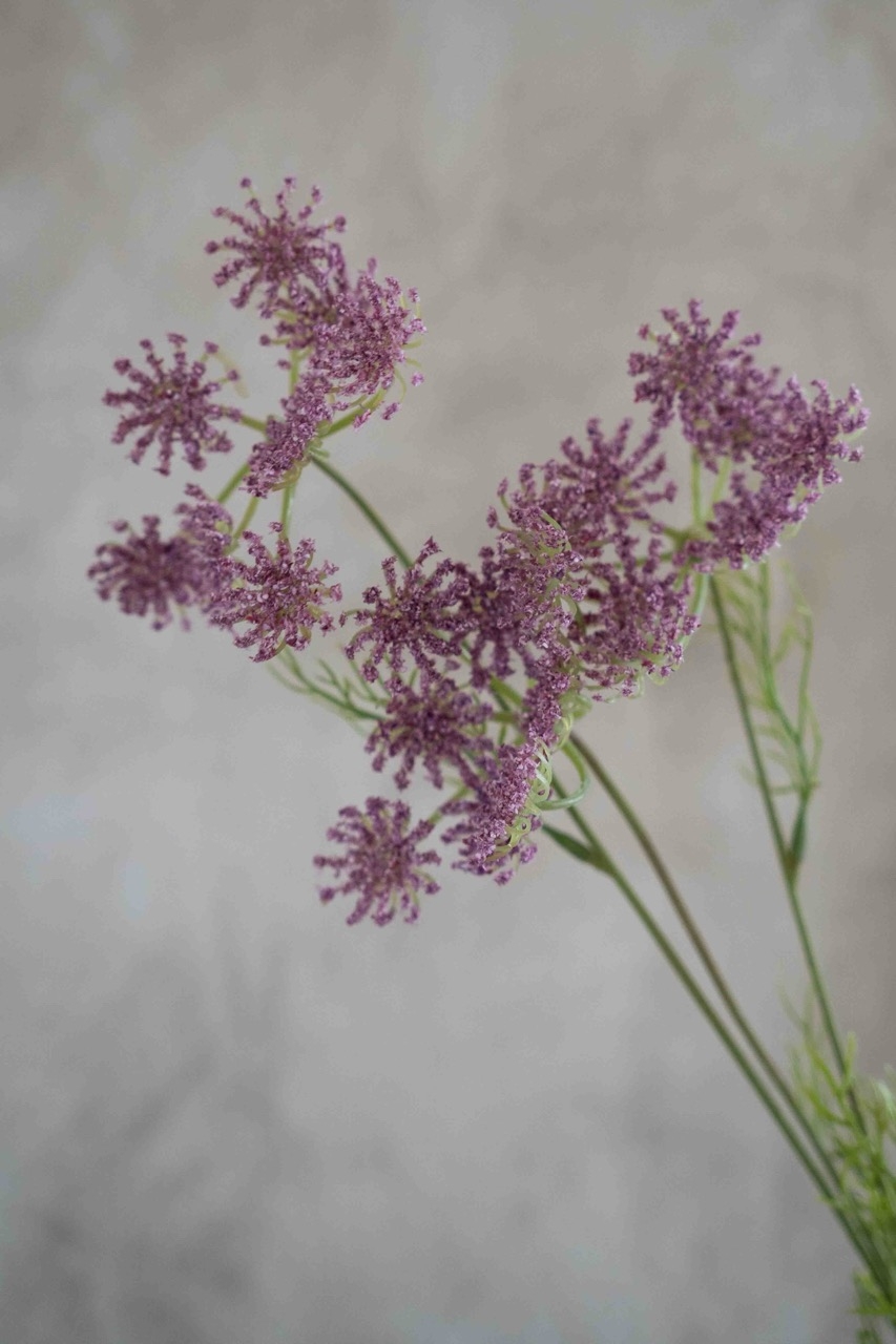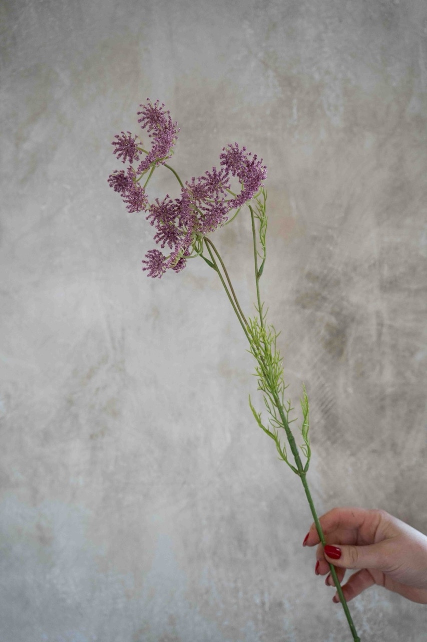 Deze tak wilde peen in paarse tint kenmerkt zich door zijn fijne, vertakte structuur en speelse bloeischermen met kleine, gedetailleerde bloemetjes. De luchtige vorm en subtiele kleur geven een natuurlijk en verfijnd effect, perfect om beweging en zachtheid toe te voegen aan een boeket.