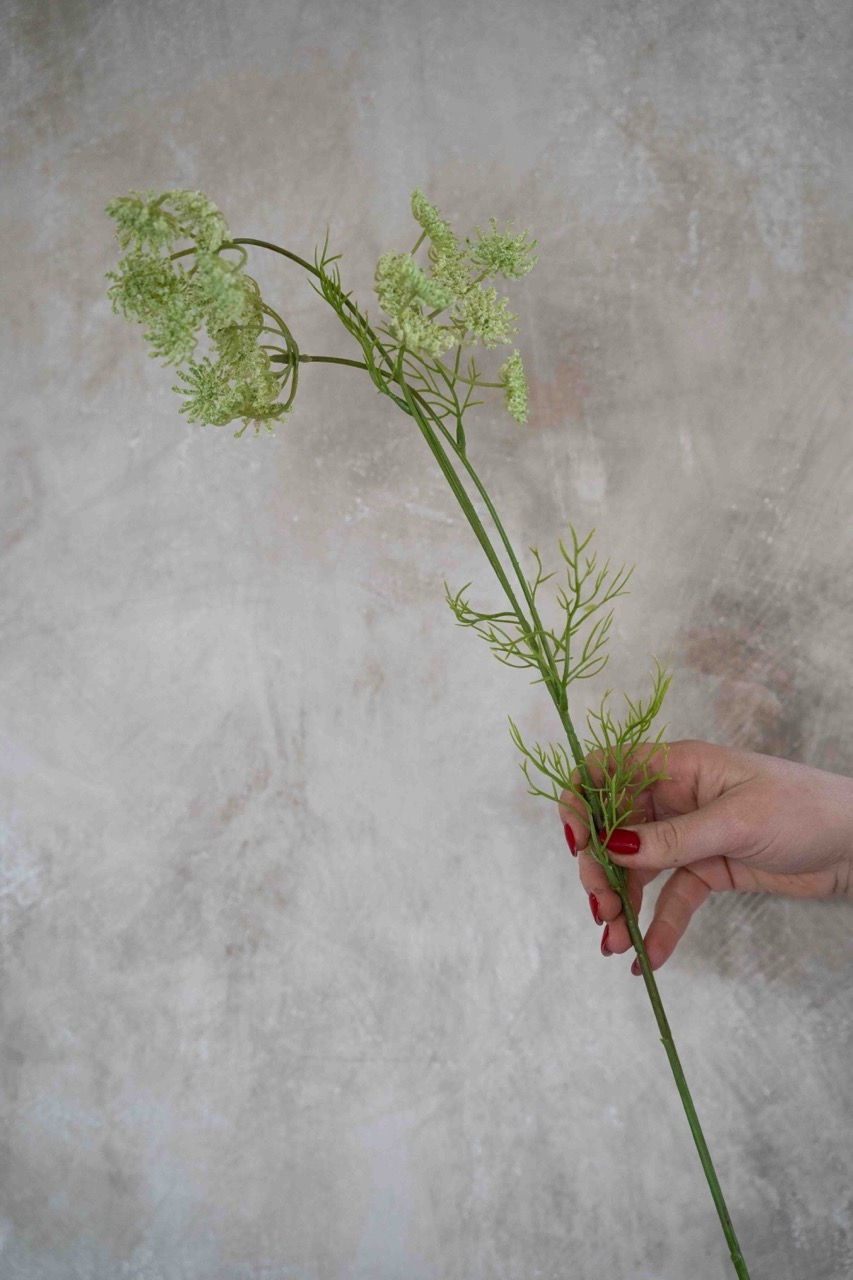 Deze tak wilde peen in witte tint kenmerkt zich door zijn fijne, vertakte structuur en speelse bloeischermen met kleine, gedetailleerde bloemetjes. De luchtige vorm en subtiele kleur geven een natuurlijk en verfijnd effect, perfect om beweging en zachtheid toe te voegen aan een boeket.