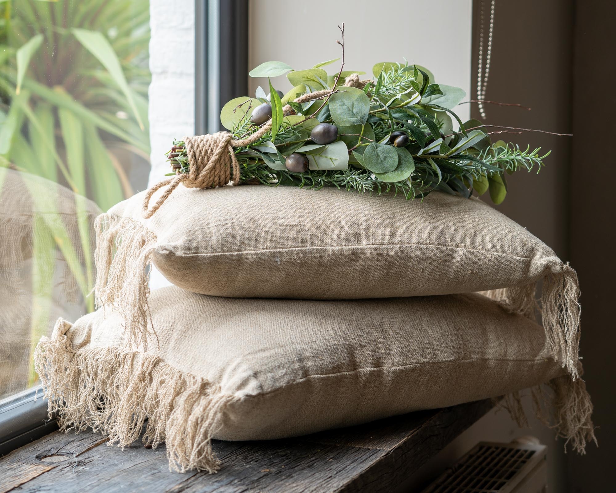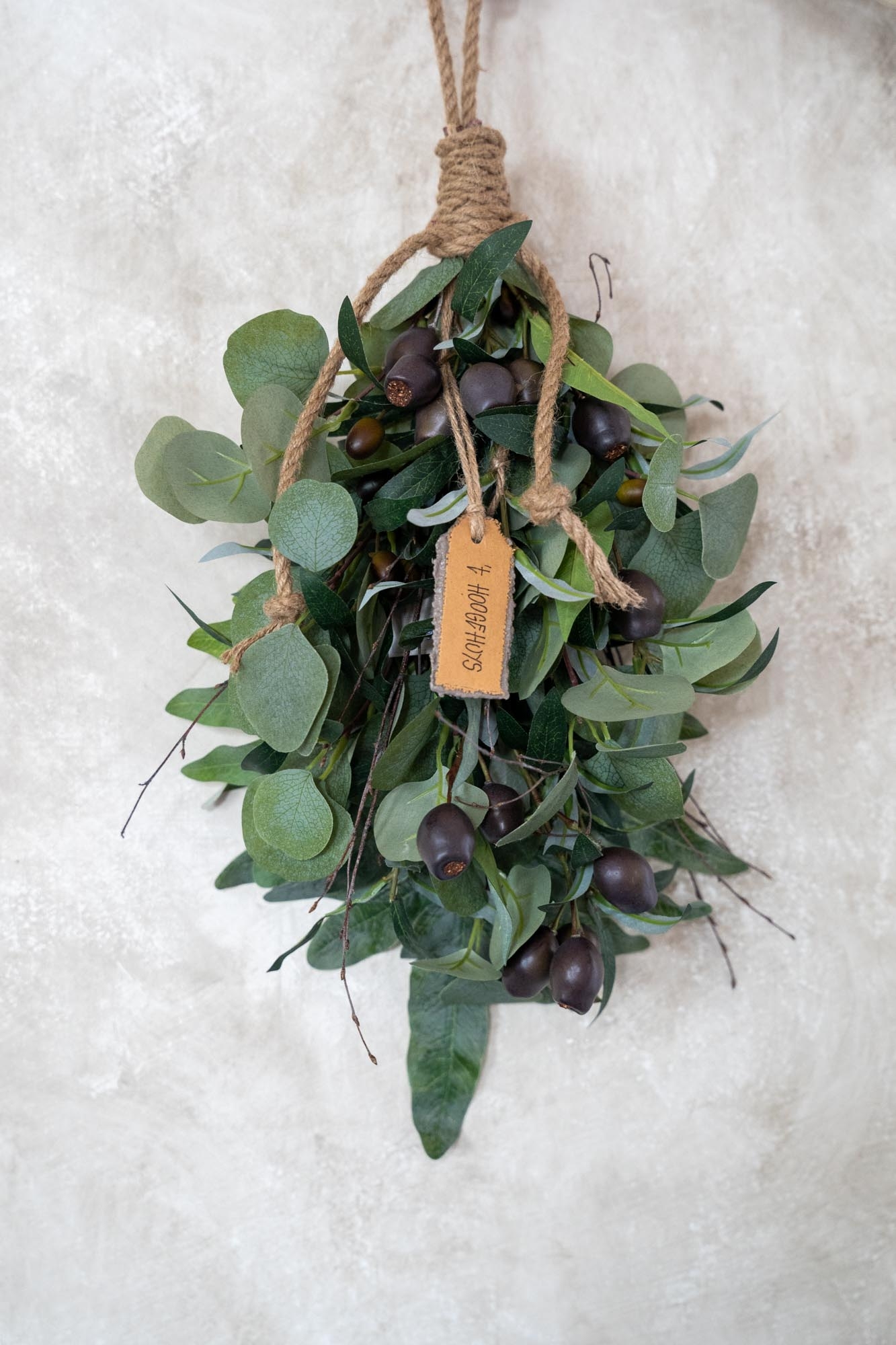 De Toef Elin is een sfeervolle handgemaakte creatie waarin aubergine bollen zijn gecombineerd met fris eucalyptusblad, sierlijke rozemarijn en natuurlijke berkentakjes. Deze mix van materialen geeft een stoere, landelijke uitstraling die moeiteloos in elk interieur past. Hang Elin bijvoorbeeld aan een deur, leg haar op een schaal of gebruik haar als decoratief accent op tafel – altijd een subtiele blikvanger.