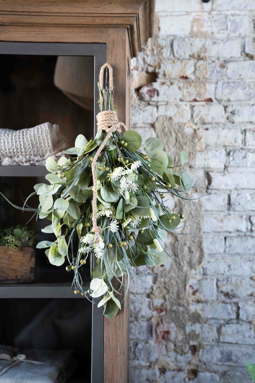 Toef Evi is een frisse, volle groentoef met verschillende tinten eucalyptusblad, fijne witte accenten en subtiele besjes. De toef is gebonden met stoer touw en heeft een natuurlijke, losse uitstraling. Mooi voor aan de deur, aan een kast of nonchalant over een haak aan de wand. Past perfect in een landelijk of sober interieur. Ook geschikt om neer te leggen op een schaal of tafel voor een rustig groen accent.