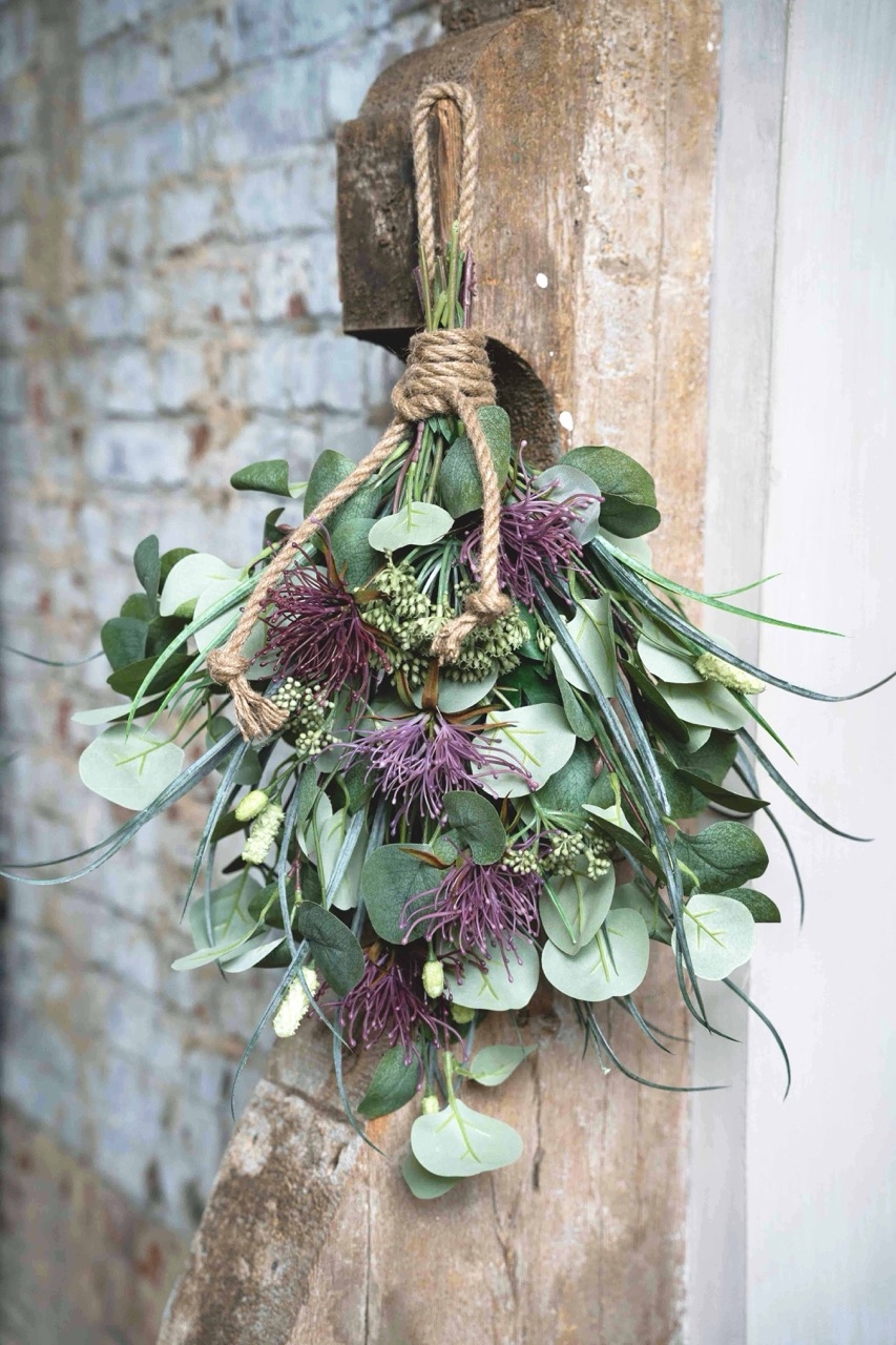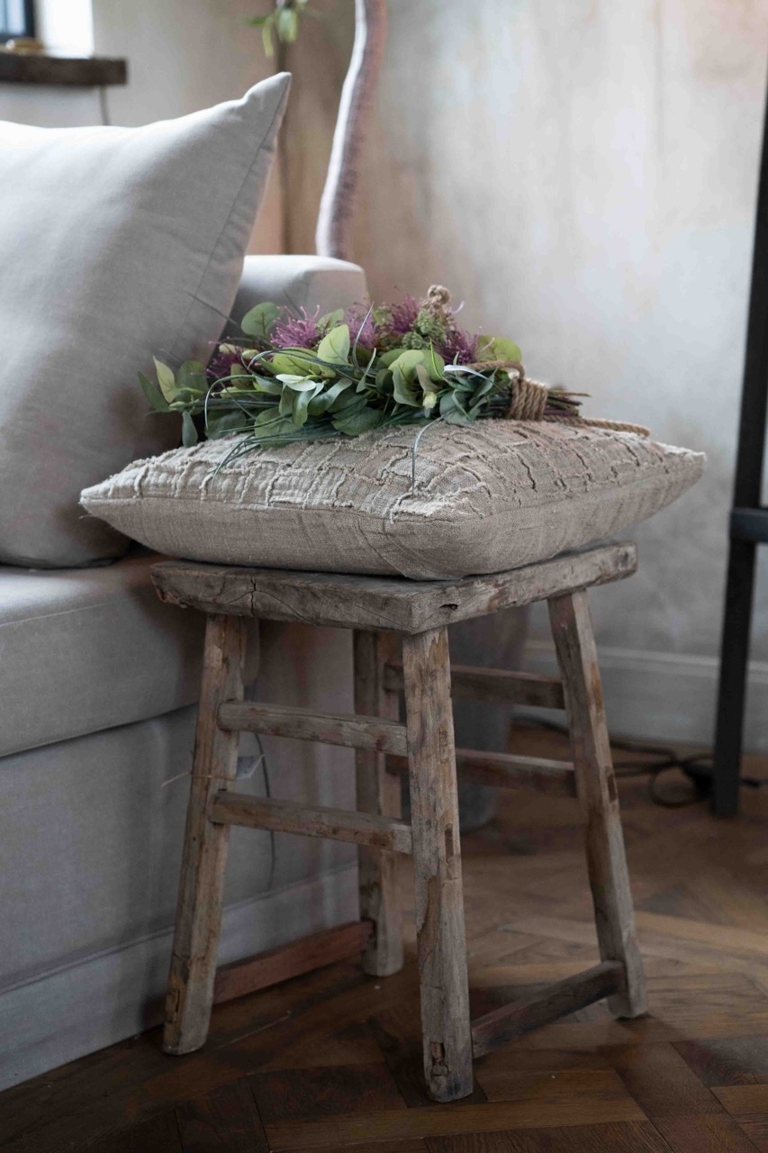 Toef Fleur is een stoere, natuurlijke toef met verschillende soorten groen blad en paarse bloemen. Samengebonden met touw. Mooi om op te hangen aan een deur, kast, kruik of wandhaak. De natuurlijke kleuren en losse vorm geven een rustige, warme sfeer in huis.