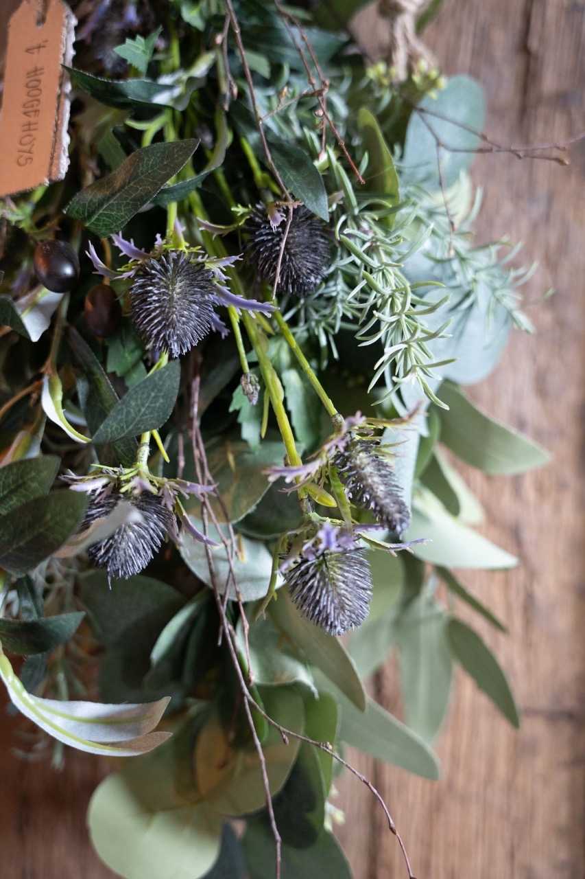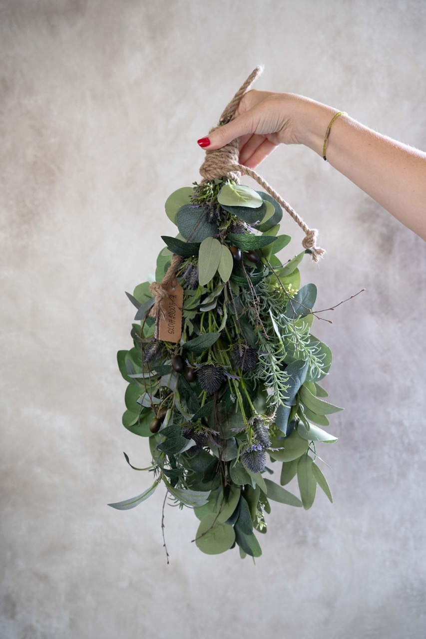 Toef Iris is een robuuste en karaktervolle toef, rijk gevuld met een mix van kunstgroen en kunstbloemen. Fris olijfgroen, zachte eucalyptus, speelse distels en echte berkentakjes zorgen samen voor een natuurlijke en levendige uitstraling.