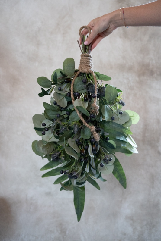 Toef Liek is een compacte decoratieve toef met kunstgroen in natuurlijke groentinten. De toef is gebonden met touw en voorzien van diverse bladsoorten zoals eucalyptus, olijf, distel en varens, wat zorgt voor een volle en rustige uitstraling. Dankzij het ophangkoord is de toef eenvoudig te bevestigen aan een kast, deur, haak of wand.