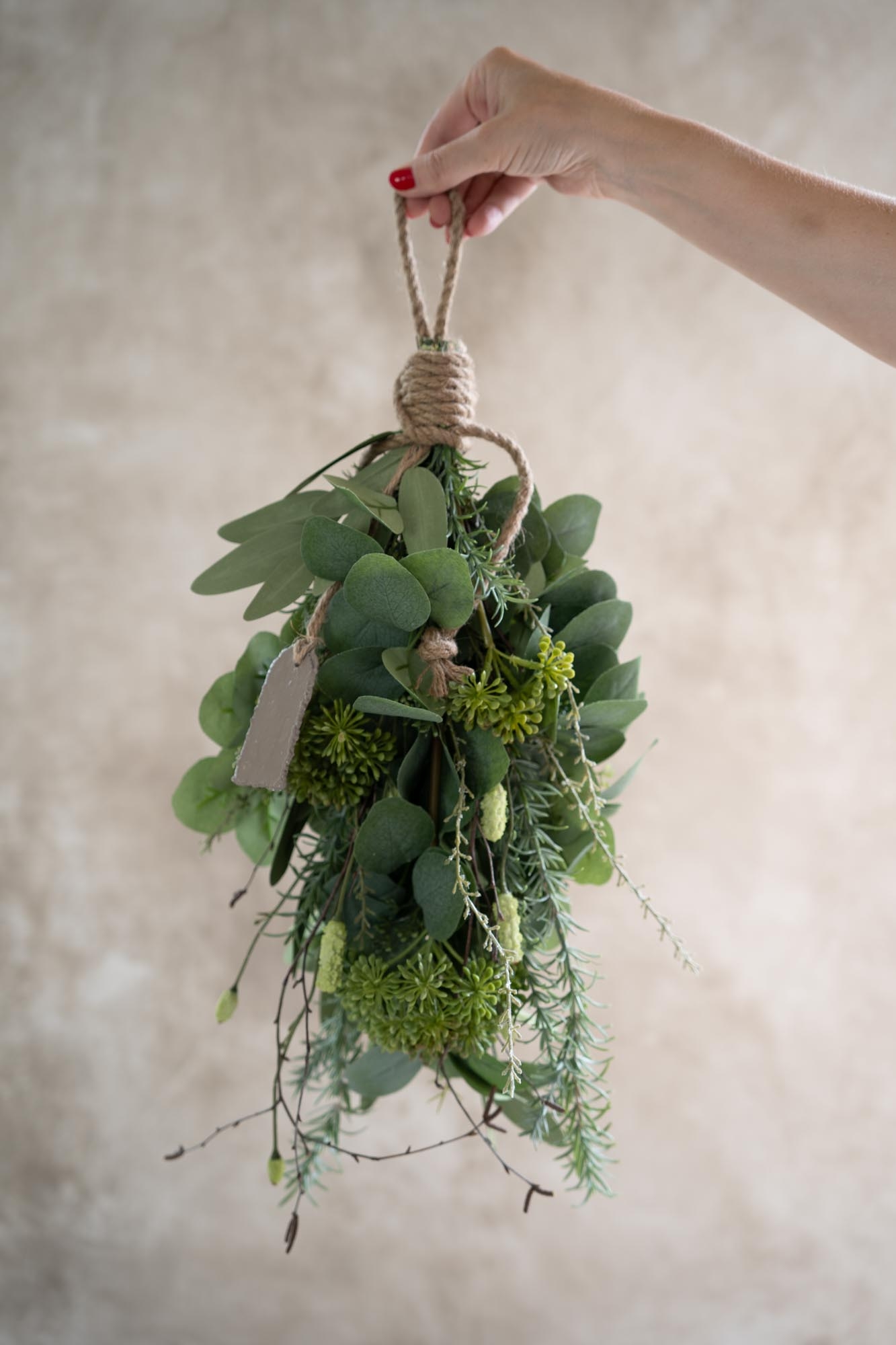De Toef Noor heeft een frisse en luchtige uitstraling door de rijke combinatie van kunstgroen en bloemen. Met groene pimpernel, eucalyptus, berkentakjes en verfijnde accenten van andere bladsoorten ontstaat er een speelse, natuurlijke compositie die in elk seizoen mooi tot zijn recht komt. De grove strik van touw maakt het geheel af en zorgt voor een pure, landelijke stijl.