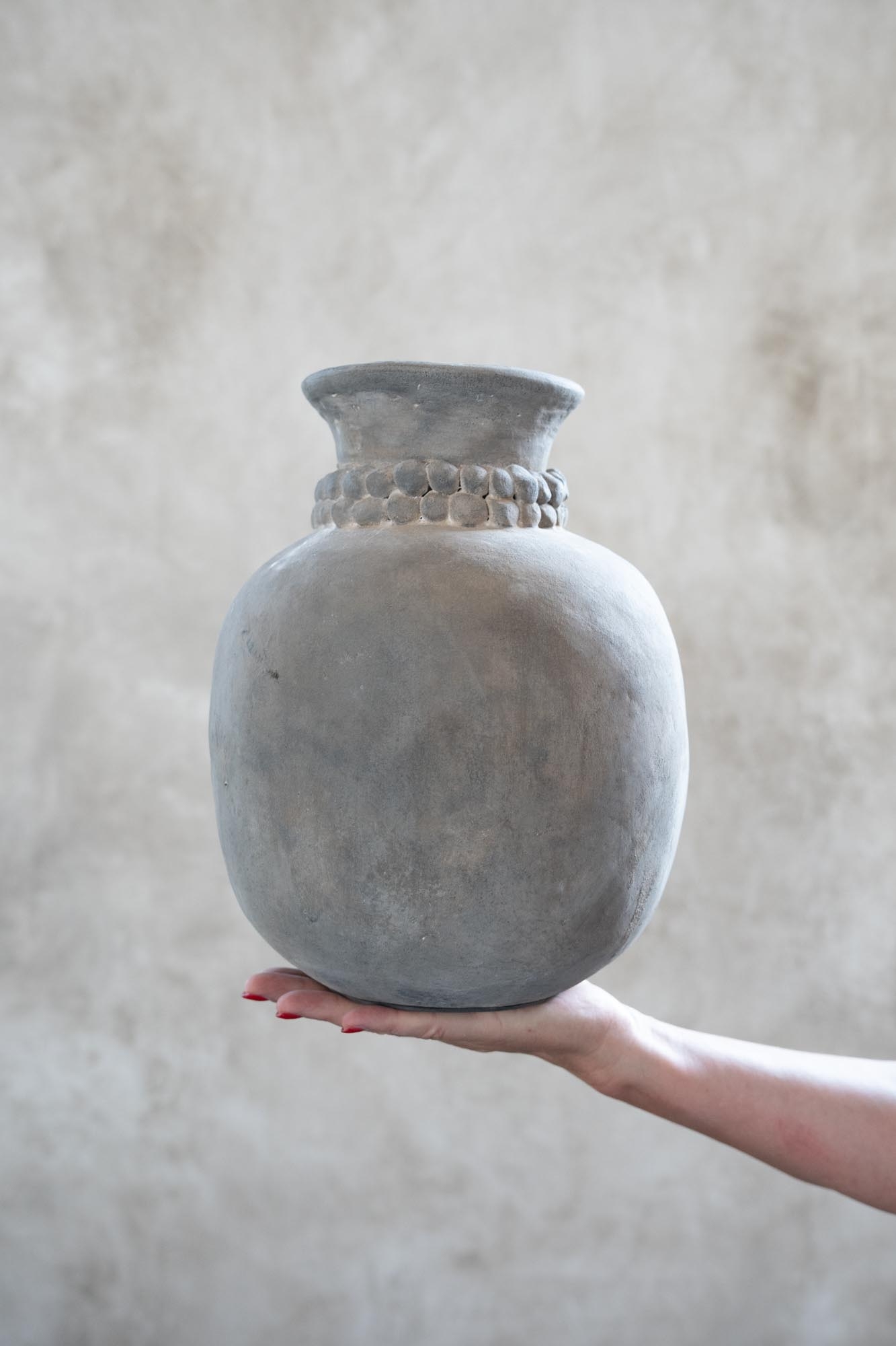 Vaas Dewi is een stoere en elegante vaas met een authentieke uitstraling. De zachte ronde vorm en de grijze afwerking geven haar een rustige, ingetogen karakter. Bijzonder detail is de band met reliëf rondom de hals, die deze vaas een subtiele sierlijkheid verleent.